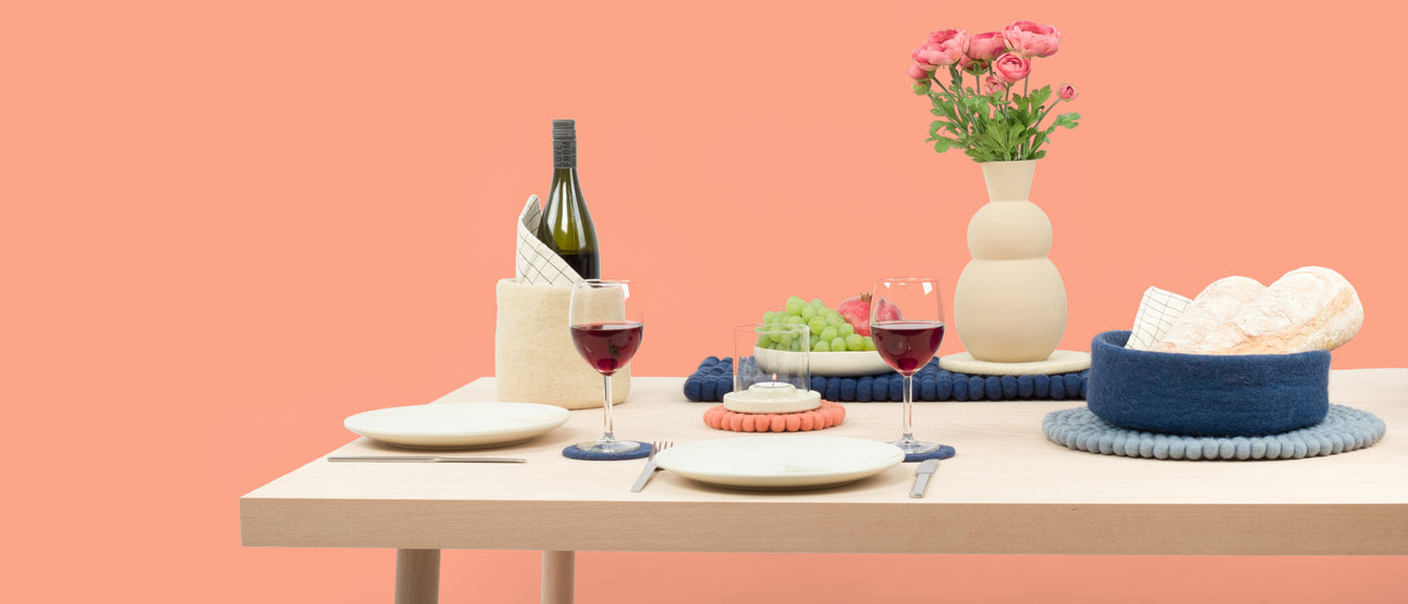 Små tillbehör från myfelt formar subtilt atmosfären i matsalen. De högkvalitativa gryt- och glasunderläggen i många olika versioner ger inte bara härlig färg till bordet, utan visar sig också vara särskilt funktionella och hållbara. myfelt Underlägg är gjorda av ren ny ull och skyddar känsliga ytor som trä och glas från fläckar och repor.