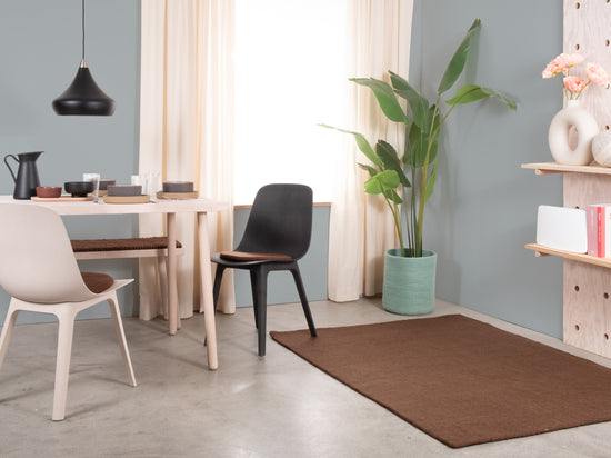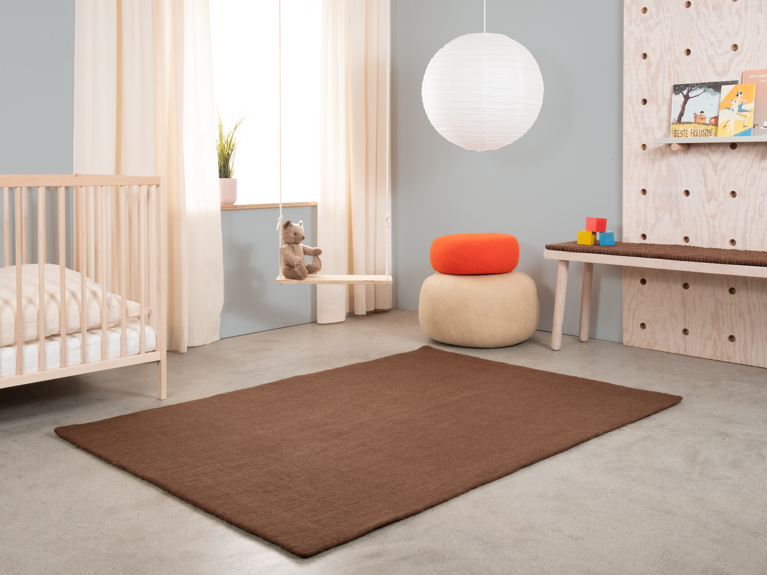 Egon satsar på varm chokladbrun. Filtmattan förankrar varje rum, skapar trivsel och struktur. Perfekt för läshörnor och vardagsrum som behöver värme. Slitstark, formstabil och behaglig att gå på. Handgjord i Nepal – av 100 % ren ny ull.