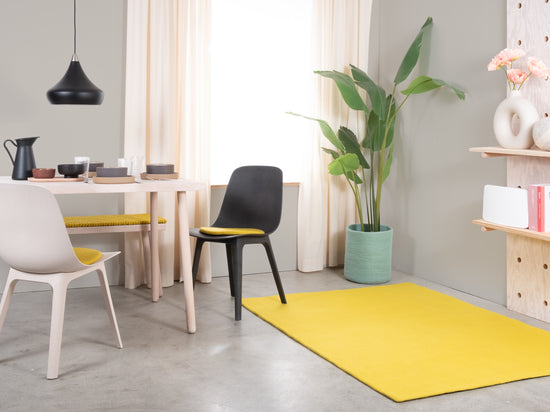 Kata ist ein Filzteppich in frischem Gelbgrün. Leuchtend, vital und voller Energie bringt er Bewegung in den Raum. Ob als fröhlicher Akzent im Wohnzimmer oder als Lichtpunkt im Arbeitsbereich. Kata sorgt für Lebendigkeit und Leichtigkeit. Weich, robust und pflegeleicht. Handgefertigt in Nepal aus 100 % reiner Schurwolle.