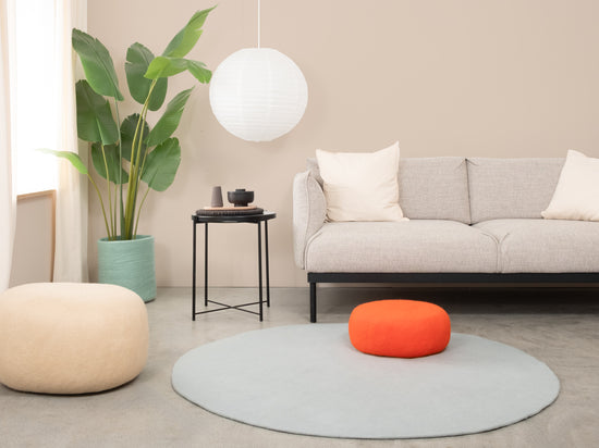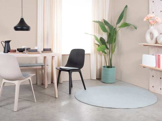 Liv är en filtmatta i kallt ljusblått. Tillför klarhet och lätthet och får små rum att kännas större. Passar till vitt, ek och neutrala toner – som lugn bas eller frisk accent. Mjuk, ljuddämpande och naturligt smutsavvisande. Handgjord i Nepal av 100 % ren ny ull.